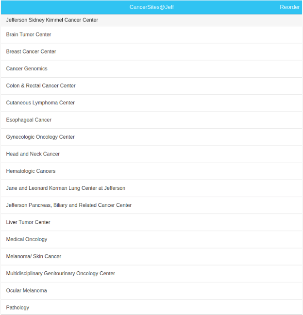 I developed two apps using Ionic and AngularJS. The main app, Cancer Docs, is designed to be used for both patients and doctors to obtain contact information for doctors in the medical oncology department. The second app I made, Cancer Sites@Jeff, was a bookmarks app that comes preloaded with bookmarks for physicians to use. Users can add, edit, reoeder and delete bookmarks.
